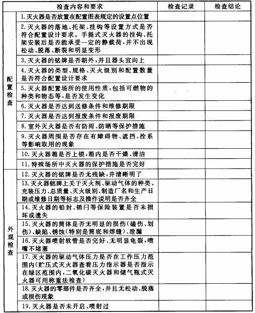 1、滅火器的日常檢查與維護(hù) 檢查的依據(jù)是《建筑滅火器配置驗(yàn)收及檢查規(guī)范》 GB50444-2008 1)滅火器的檢查與維護(hù)應(yīng)由相關(guān)技術(shù)人員承擔(dān)。 2)每次送修的滅火器數(shù)量不得超過(guò)計(jì)算單元配置滅火器總數(shù)量的1/4。超出時(shí),應(yīng)選擇相同類型和操作方法的滅火器替代,替代滅火器的滅火級(jí)別不應(yīng)小于原配置滅火器的滅火級(jí)別。 3)檢查或維修后的滅火器均應(yīng)按原設(shè)置點(diǎn)位置擺放。 4)需維修、報(bào)廢的滅火器應(yīng)由滅火器生產(chǎn)企業(yè)或?qū)I(yè)維修單位進(jìn)行。 5)滅火器的配置、外觀等應(yīng)按附錄C的要求每月進(jìn)行一次檢查。 6)下列場(chǎng)所配置的滅火器,應(yīng)按附錄C的要求每半月進(jìn)行一次檢查。 ①候車(機(jī)、船)室、歌舞娛樂(lè)放映游藝等人員密集的公共場(chǎng)所; ②堆場(chǎng)、罐區(qū)、石油化工裝置區(qū)、加油站、鍋爐房、地下室等場(chǎng)所。 7)日常巡檢發(fā)現(xiàn)滅火器被挪動(dòng),缺少零部件,或滅火器配置場(chǎng)所的使用性質(zhì)發(fā)生變化等情況時(shí),應(yīng)及時(shí)處置。 8)滅火器的檢查記錄應(yīng)予保留。
