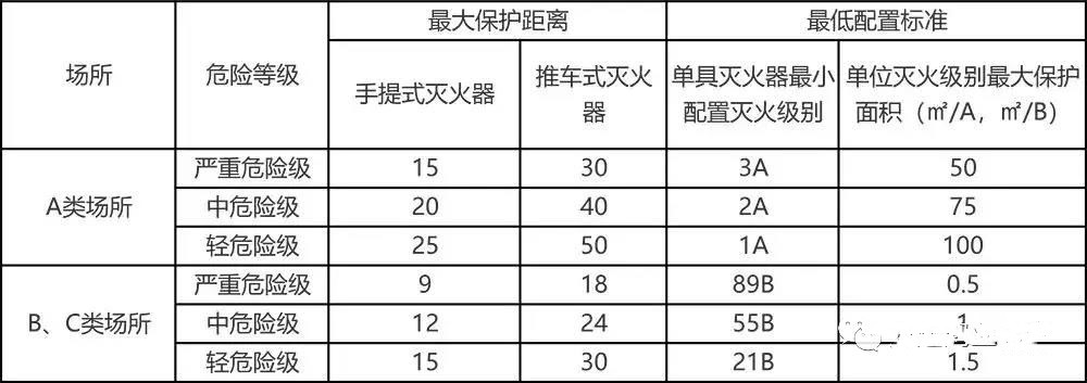 舉例: 計(jì)算單元面積為1000㎡,建筑內(nèi)僅設(shè)消火栓,保護(hù)場(chǎng)所為A類中危險(xiǎn)級(jí),那么Q=0.9×1000÷75=12(A),如果設(shè)置3個(gè)配置點(diǎn)(配合A類中危險(xiǎn)級(jí)場(chǎng)所保護(hù)最大保護(hù)距離20m),那每個(gè)配置點(diǎn)滅火級(jí)別為12÷3=4(A),則可根據(jù)滅火級(jí)別確定每個(gè)配置點(diǎn)的滅火器數(shù)量,即2具2A滅火器。