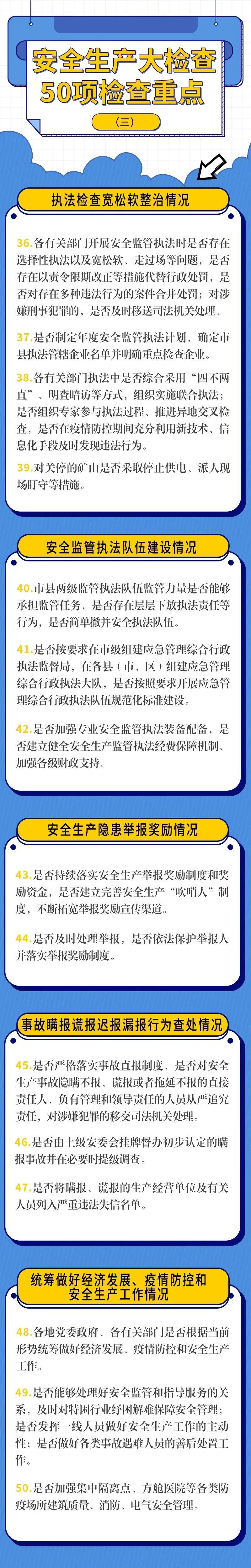 此次綜合督導(dǎo)和考核巡查將更加注重問題導(dǎo)向,突出解決問題,切實(shí)提升工作效能,進(jìn)一步推動(dòng)各地區(qū)、各有關(guān)部門統(tǒng)籌做好經(jīng)濟(jì)發(fā)展、疫情防控和安全生產(chǎn)“三件大事”,堅(jiān)決落實(shí)安全生產(chǎn)責(zé)任措施,堅(jiān)決防范遏制重特大事故,為經(jīng)濟(jì)發(fā)展和社會(huì)穩(wěn)定提供更加堅(jiān)實(shí)的安全保障。