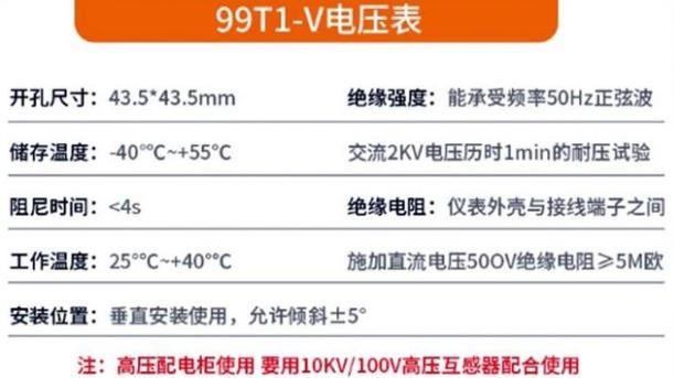 不過(guò)這種機(jī)械式指針式電壓表對(duì)安裝位置的耐振動(dòng)和沖擊的影響是有要求的: 安裝位置→儀表適用垂直安裝,允許傾斜±5°; 存儲(chǔ)溫度→規(guī)定在-40℃~ +70℃; 阻尼時(shí)間→小于4s(槽型表小于6s); 工作環(huán)境→參比溫度為23℃±2℃,相對(duì)溫度40 ~ 85%;工作環(huán)境溫度極限為-40℃+ 60℃,相對(duì)溫度不超過(guò)95%,且空氣中無(wú)灰塵和腐蝕性氣體; 絕緣強(qiáng)度→能承受頻率為50Hz的正弦波交流2KV電壓1分鐘的耐壓試驗(yàn),施加直流電壓500V時(shí)的絕緣電阻≥5MΩ。 這種高壓電壓表為了安全,必須配置10/0.1KV高壓電壓互感器使用的,見(jiàn)下圖所示