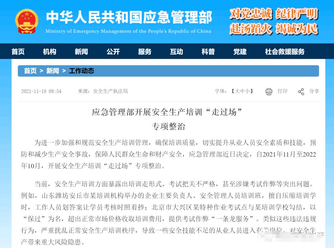 為進(jìn)一步加強(qiáng)和規(guī)范安全生產(chǎn)培訓(xùn)管理,確保培訓(xùn)質(zhì)量,切實(shí)提升從業(yè)人員安全素質(zhì)和技能,預(yù)防和減少生產(chǎn)安全事故,保障人民群眾生命和財(cái)產(chǎn)安全,應(yīng)急管理部近日決定,自2021年11月至2022年10月,開展安全生產(chǎn)培訓(xùn)“走過場”專項(xiàng)整治。