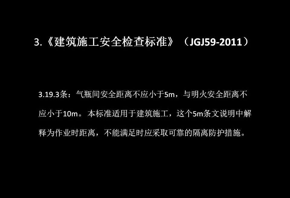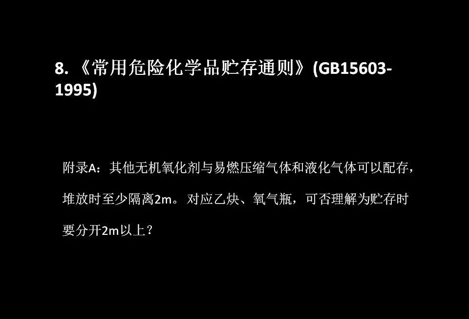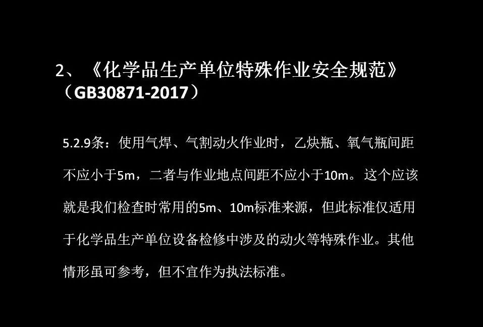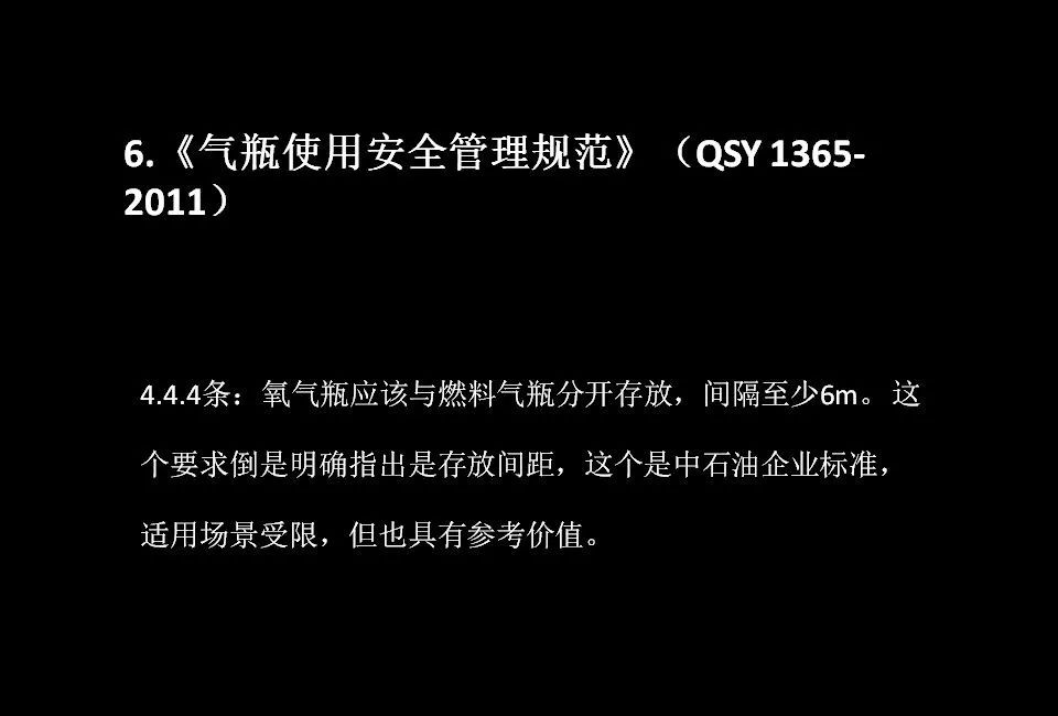綜上,各個(gè)標(biāo)準(zhǔn)規(guī)定不盡相同,每個(gè)標(biāo)準(zhǔn)都有其適用范圍,除去建筑、電力、化工這些行業(yè)另有規(guī)定,在一般工貿(mào)行業(yè),可適用《焊接與切割安全》和《常用危險(xiǎn)化學(xué)品貯存通則》,則乙炔、氧氣瓶之間存放距離不低于2m,氣瓶與明火距離5m以上。