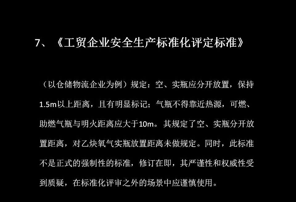 《氣瓶搬運(yùn)裝卸儲(chǔ)存使用安全規(guī)定》(GB34525-2017)未做規(guī)定,是否意味著此距離可繼續(xù)放寬? 而從風(fēng)險(xiǎn)管控的角度看,乙炔和氧氣,一個(gè)易燃一個(gè)助燃,是必須留有一定安全距離的,根據(jù)企業(yè)現(xiàn)場(chǎng)環(huán)境不同和對(duì)風(fēng)險(xiǎn)承受能力的不同,企業(yè)適當(dāng)?shù)膹膰?yán)管理是很有必要的。 但在安全生產(chǎn)檢查中,每一條隱患的提出都應(yīng)有依據(jù)作為支撐,對(duì)此,必須謹(jǐn)慎對(duì)待,并做進(jìn)一步的研究。