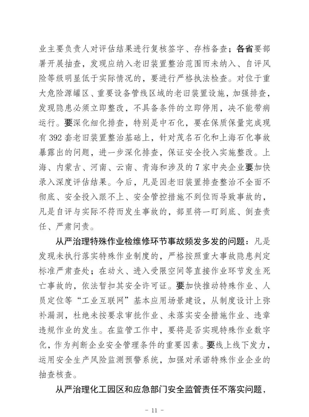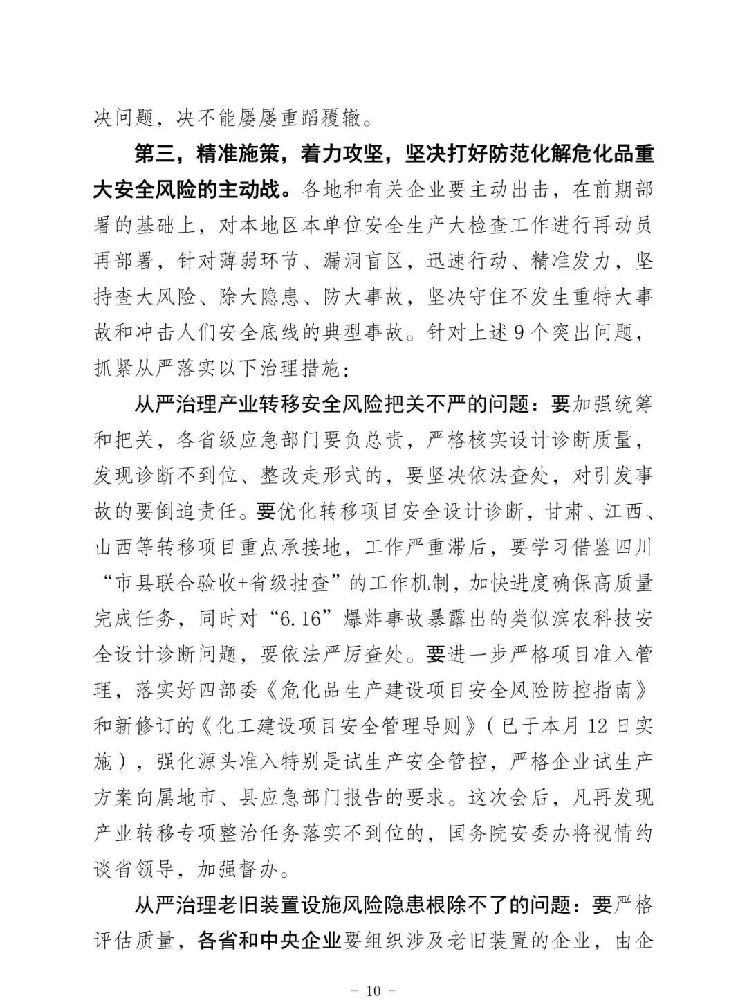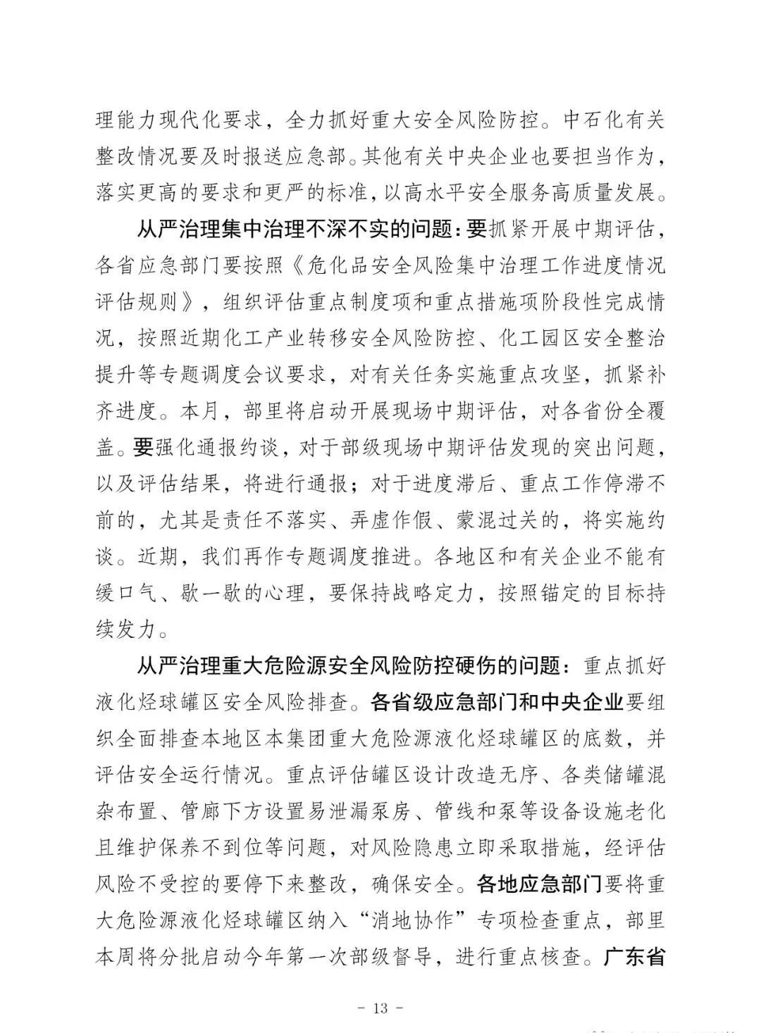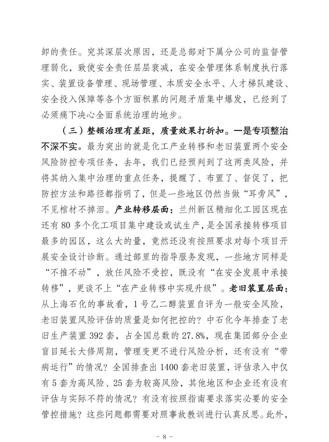 昨天上午全國;娨曤娫挄h孫廣宇副部長講話精神: ——八個從嚴(yán)治理 一是從嚴(yán)治理產(chǎn)業(yè)轉(zhuǎn)移安全風(fēng)險把關(guān)不嚴(yán)的問題。 二是從嚴(yán)治理老舊裝置風(fēng)險隱患根除不了的問題。 三是從嚴(yán)治理特殊作業(yè)和檢維修環(huán)節(jié)事故多發(fā)頻發(fā)的問題。 四是從嚴(yán)治理化工園區(qū)和應(yīng)急管理部門安全監(jiān)管責(zé)任不落實問題。 五是從嚴(yán)治理央企總部安全履職不力的問題。 六是從嚴(yán)治理集中治理不深不實的問題。 七是從嚴(yán)治理重大危險源安全風(fēng)險防控硬傷的問題。 八是從嚴(yán)治理打擊非法違法行為不徹底的問題。